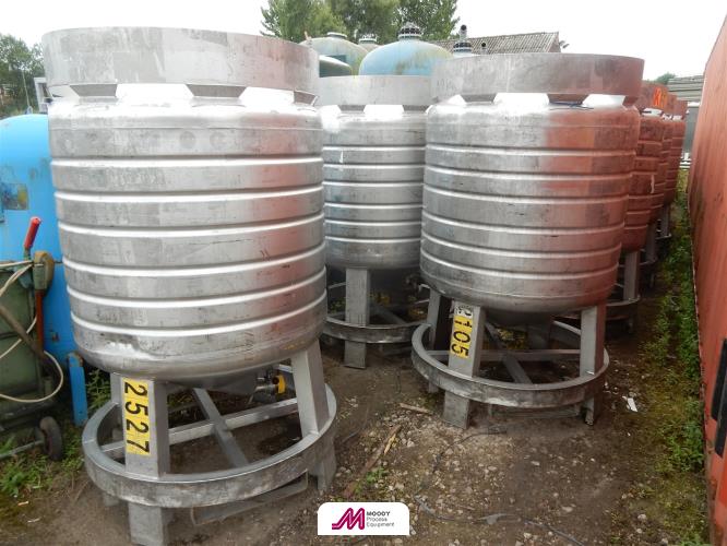 Technical features: - Palletised tank for storing and internal handling - Shaped base with fork truck slot for a pallet truck - Bottom with a deep drawn shaped discharge to grant full product discharge - 304 Stainless steel cold rolled 2b finish - Cold forged bottom covers with optimised shape, minimum thickness 1.5mm - Robotized TIG welding process - Pickled and passivated seams - Bath galvanised mild steel palletised base - Stainless steel ring welded to the tanks and screwed to the base - Max hydraulic test pressure: 2.0 bar (200Kpa) - Max working pressure: 0.5 bar (50 Kpa) --- Equipment: - 400 mm. diameter manhole - Lid with clamp closure (standard) - Butterfly outlet, diameter DN 50 (2") - 1" diameter threaded connection for safety valve - Pressure relief valve (max press. 0.5 bar) --- Optional items (upon request): - 316 Stainless Steel - Insulation - Water Jacket - Sprayball - Prop type agitator - Level gauges - Additional connections ------- For further details please contact Mark 01777 712110